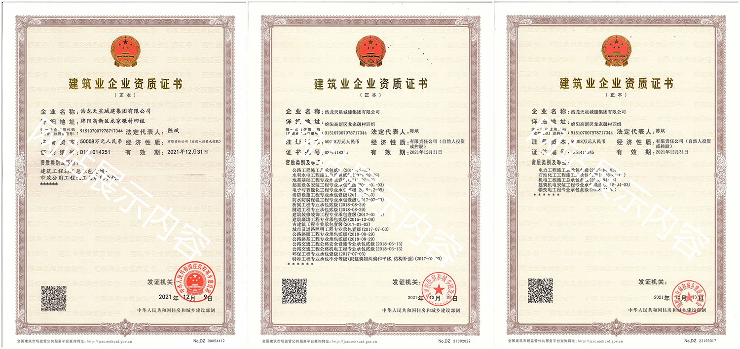浩龍?zhí)煨浅墙瘓F(tuán)有限公司,2007年成立于“李白故鄉(xiāng)、中國科技城”—四川省綿陽市,企業(yè)注冊(cè)資本金5.0008億元。公司共有27項(xiàng)建筑業(yè)企業(yè)資質(zhì),其中國家一級(jí)資質(zhì)11項(xiàng),二級(jí)資質(zhì)10項(xiàng),三級(jí)資質(zhì)5項(xiàng),特種資質(zhì)不分等級(jí)1項(xiàng),類別涵蓋建筑、市政、水利、機(jī)電、隧道、起重設(shè)備安裝等基礎(chǔ)及未來發(fā)展重點(diǎn)專業(yè)。公司下設(shè)三個(gè)辦事處,業(yè)務(wù)范圍輻射全國,在建項(xiàng)目三十余個(gè),累計(jì)完成產(chǎn)值超11億元。公司是綿陽市建筑施工企業(yè)協(xié)會(huì)副會(huì)長(zhǎng)單位、綿陽遂寧商會(huì)會(huì)長(zhǎng)級(jí)單位、綿陽首批建筑業(yè)綠卡企業(yè),在綿陽本地企業(yè)中綜合實(shí)力名列前茅。